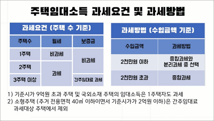 주택임대소득고 상가임대소득과 동일하게 부동산 임대소득입니다. 주택임대소드은 국민들의 주거안정 측면에서 비과세 혜택이 가능합니다. 부부합산해서 기준시가 9억원 이하의 국내주택 1채만 가지고 있거나 2주택 이하의 월세 없이 보증금만 받는 경우에 소득세는 비과세 대상입니다.