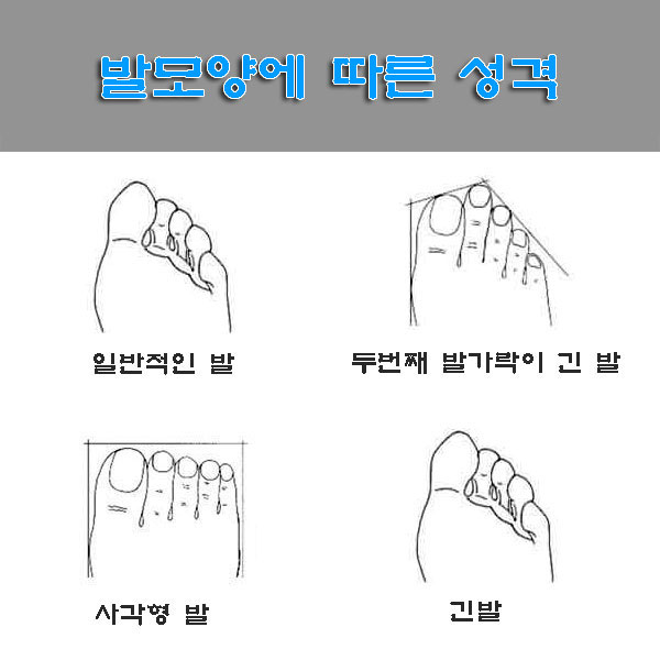 발가락 모양에 따라 성격을 알 수 있다고 합니다. 두 번째 발가락이 엄지발가락보다 더 크거나 발가락 일부가 서로 겹치거나 혹은 모두 똑바로 되어 있는 등 모양에 따라 성격도 알 수 있다고 합니다. 예를 들어 엄지손가락이 곧은지 구부러져 있는지 또는 앉을때 다리를 두는 방식, 발의 모양 등을 통해 성격을 알 수 있다고 합니다.