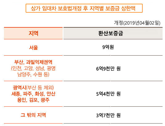 임대차 범위를 정하는 환산보증금의 범위는 서울 지역은 9억이며, 과밀억제권역은 6억 9천만 원, 광역시·세종시·경기안산·용인·김포·광주·파주·화성 등은 5억 4천만 원, 그 밖의 지역은 3억 7천만 원입니다.
