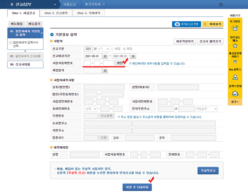 사업자등록번호」 를 입력하고 확인버튼을 클릭합니다.