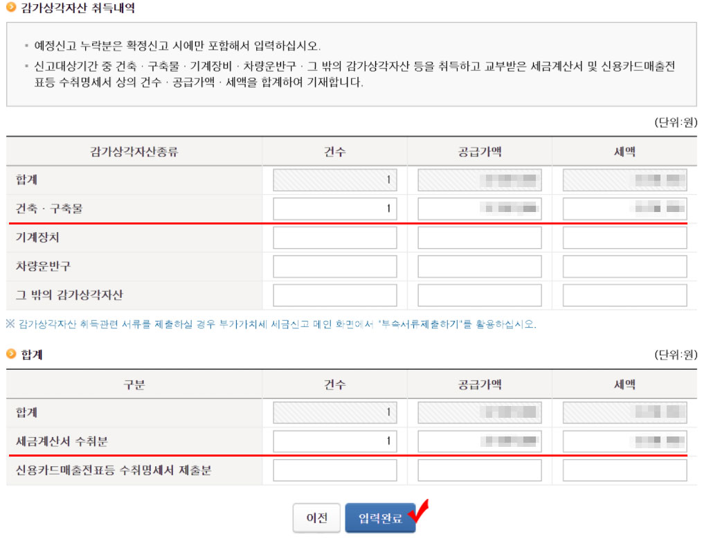 「건축·구축물」 항목에 세금계산서(건물분) 금액을 입력하고, 「합계」란에도 똑같이 입력하고 입력완료를 클릭합니다.