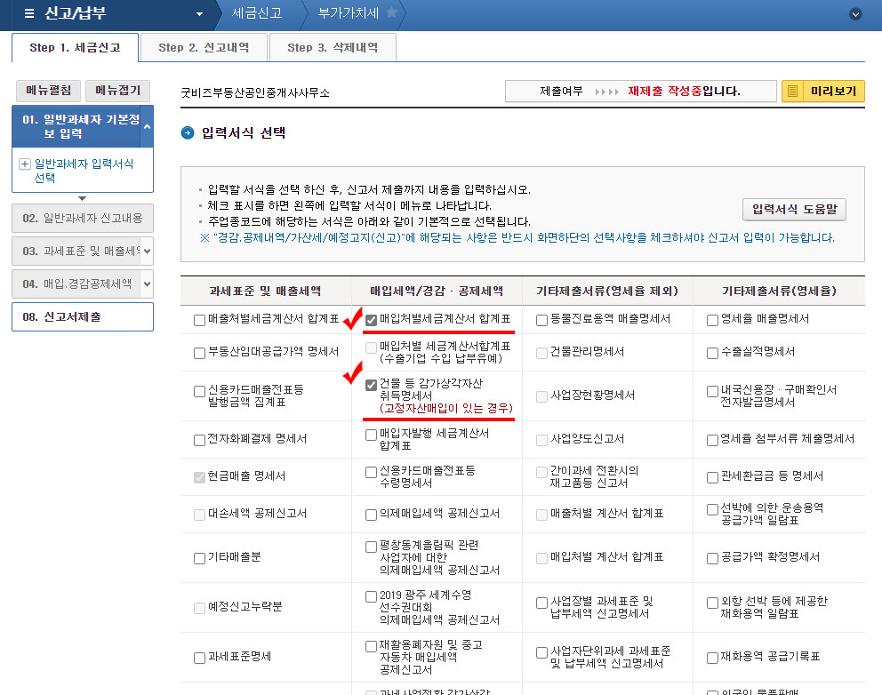 매입처벌세금계산서 합계표」「건물 등 감가상각자산 취득명세서(고정자산매입이 있는 경우」 에 체크합니다.