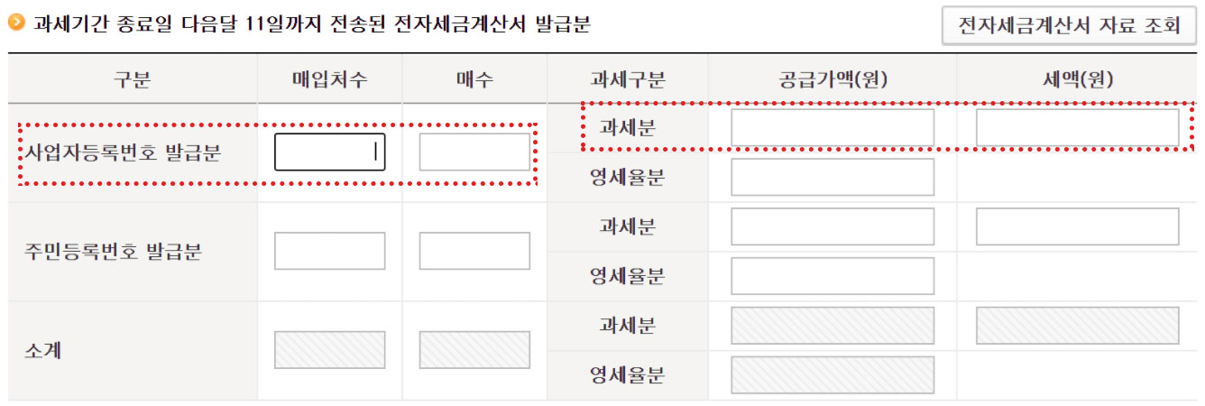 사업자등록번호 발급분」 '매입처수''매수'를 각각 입력하고, 「과세분」 '공급가액()''세액()'를 입력합니다.