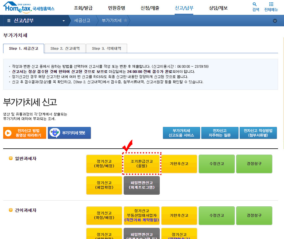 부동산 취득시 사업주는 부가가치세를 조기환급 받을 수 있기 때문에 '정기신고(확정/예정)'를 선택하면 안되고 '조기환급신고(월별)' 메뉴를 선택해야 합니다.