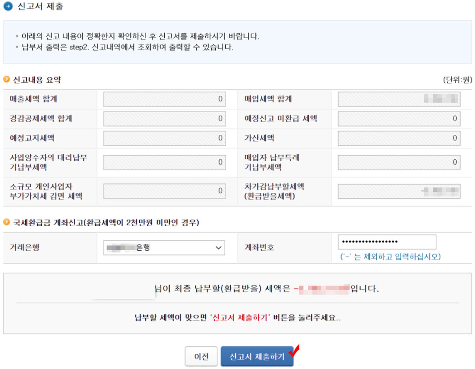 그 다음 신고서 제출 내역을 꼼꼼히 확인한 다음 '신고서 제출하기' 버튼을 클릭하면 모든 작업이 마무리됩니다.
