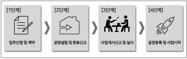 지식산업센터는 입주절차가 있습니다. 절차는 위 그림과 같이 4단계로 분류되며, 임대업으로 변경 가능한 시기가 4단계 공장등록 및 사업 시작부터 가능합니다. 입주계약 단계에 제시했던 사업자등록증에 임대업을 추가하면 됩니다.