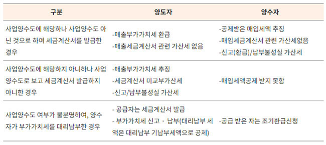 참고로 포괄 양수도 계약을 하더라도 양도자가 사업양도에 대해 부가가치세를 신고납부하고 양수인이 매입세액을 공제받았거나, 양수인이 양도인에게 부가가치세를 받아 대리납부하고(사업양도에 따른 대리납부 제도) 세액공제를 받았어도 그 발행한 세금계산서는 적정한 것으로 인정됩니다.