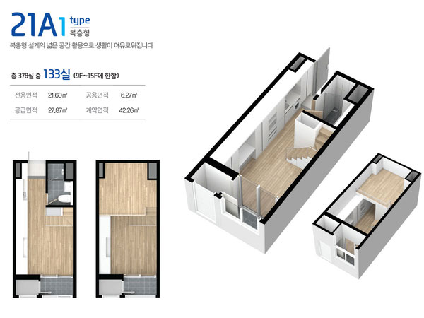 ○ 9층~15층 147실, 21A타입(133실), 21D1(14실) 복층형 유니트으로 구성