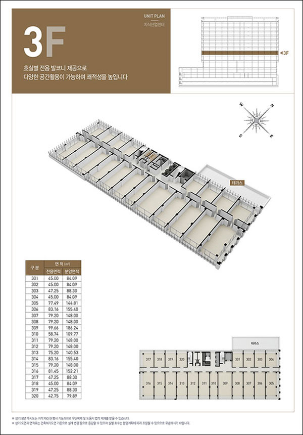 3층은 일반층(층고:3.9m)으로 되어 있으며, 지식산업센터 20개 호실로 구성되었습니다. 북동향 4개호실은 넓은 야외 테라스가 있습니다.