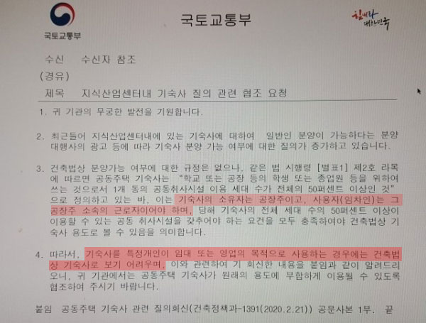 기숙사는 지식산업센터 지원시설이기 때문에 원칙적으로 '입주기업 만이 그 임직원들을 위하여' 분양 받을 수 있습니다. 그런데 지금은 관계기관의 단속이 이루어지지 않고 있는 데다 입주기업 임직원의 수요 부족으로 인해 편리한 교통과 생활편의성을 갖춘 기숙사에 일반인들도 임차인이 되고 있다 보니 일반인도 기숙사를 분양받거나 매수해 임대업을 하는 사례가 늘고 있는데요, 이는 명백한 탈법행위에 해당된다는 점을 간과해서는 안됩니다.
